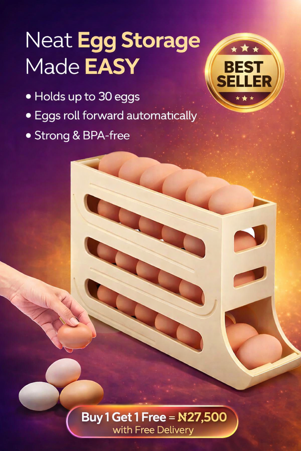 This 4-tier automatic rolling egg dispenser helps you keep your eggs arranged in one place and easy to pick anytime you need them.